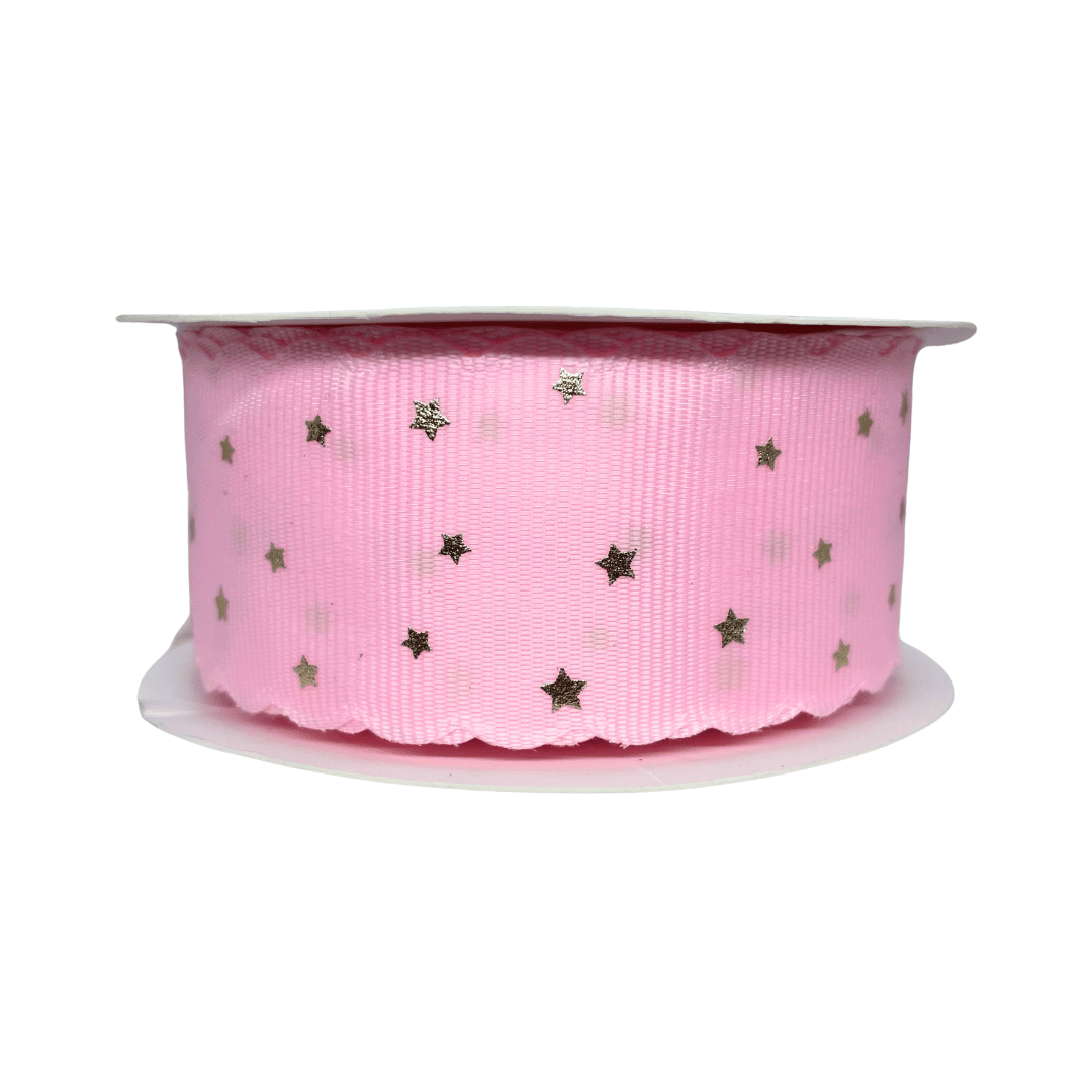 Fita Gorgurão Com Borda Ondulada e Estampa Estrela Dourada 38mm | Metro | Cor: Rosa Bebê